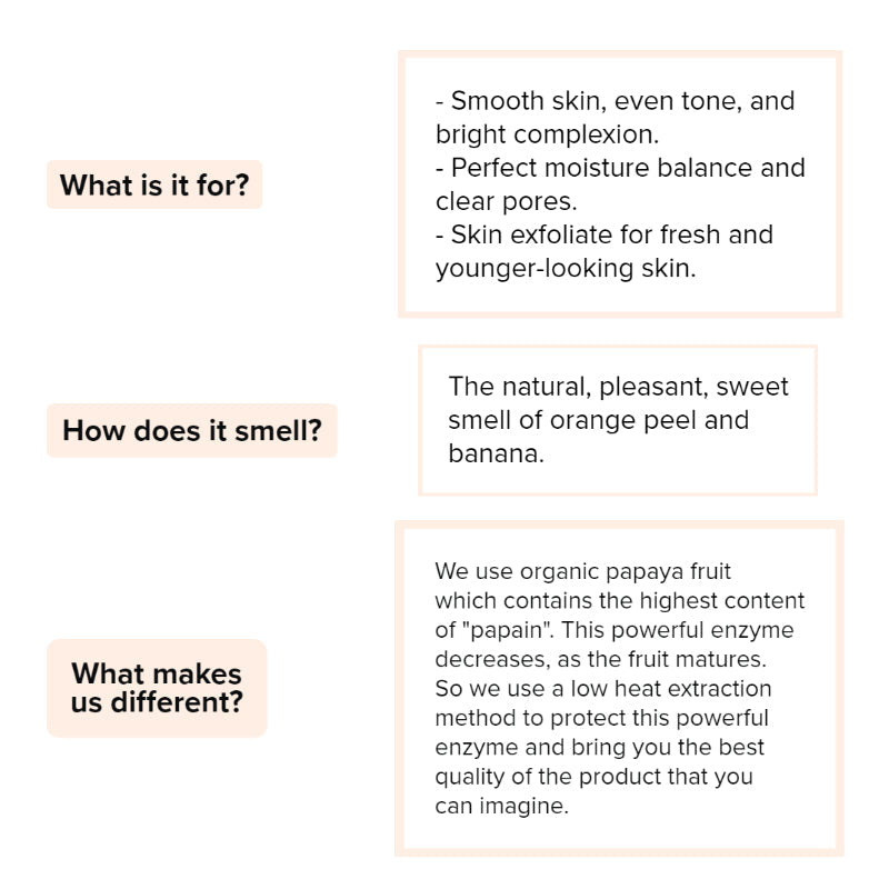 The Banana Pure Exfoliating Mask is made from organic papaya fruit that has the highest content of "papain". This powerful enzyme decreases, as the fruit matures. That’s why it is extracted using low heat to protect this powerful enzyme, so we can enjoy the best quality of the product that can be imagined.