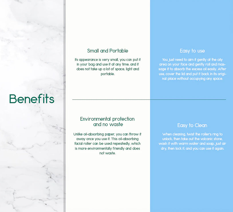 Our innovative face roller is crafted from genuine, natural volcanic stone , famous for its exceptional oil-absorbing power. Just a few gentle rolls instantly wick away excess facial oil and grease, revealing a clean, matte complexion without disturbing your makeup.